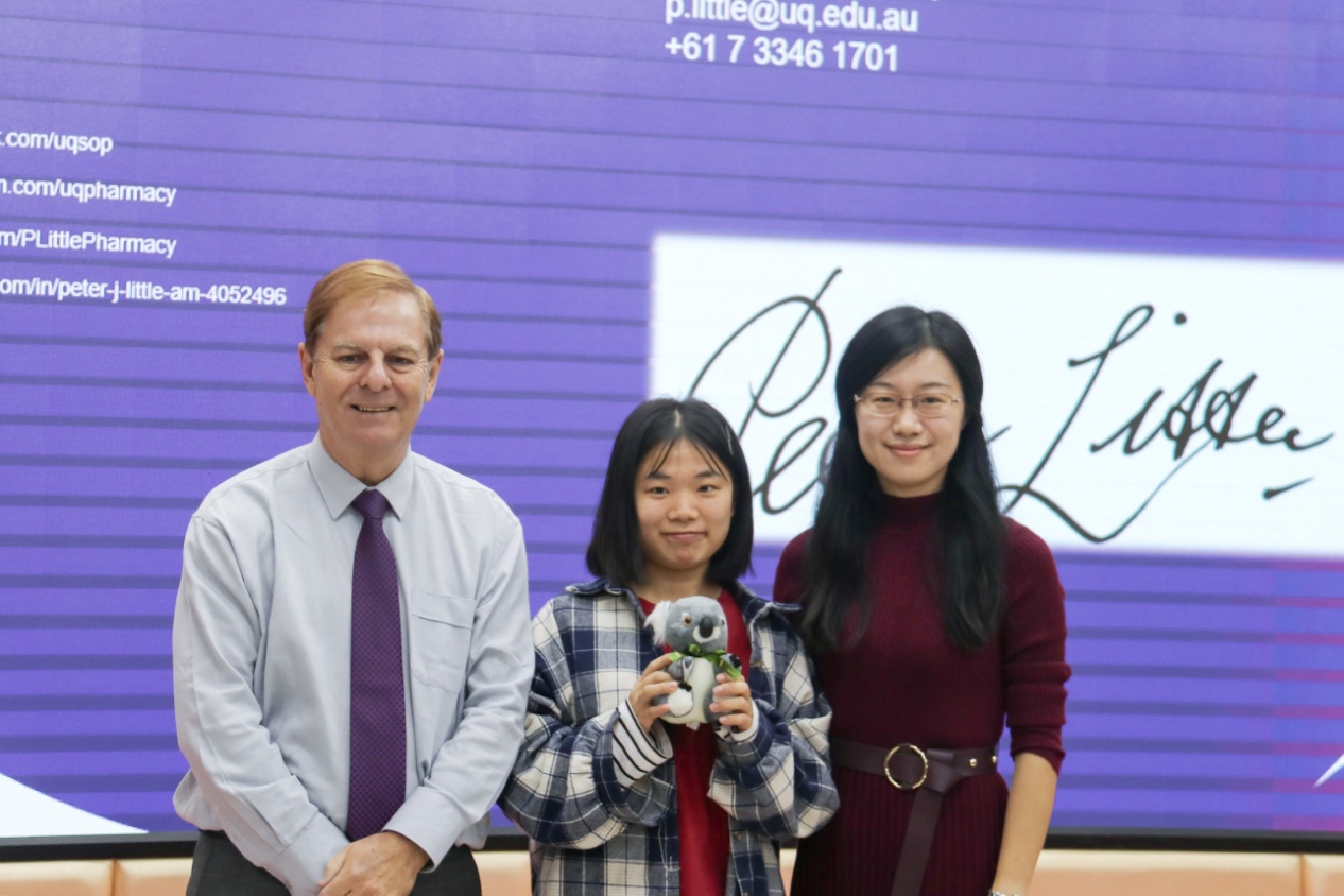 澳大利亚昆士兰大学药学院Peter James Little教授、我校药学院副院长曹颖男教授为药学学子赠送纪念品