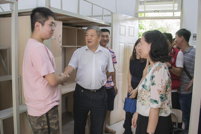 同时,为了更好地了解新生初来乍到的生活情况,帮助新生解决问题,引领新生尽快适应新环境,进一步做好新生入学教育工作准备,我校王庭槐校长、周云书记带队,从学校到院(系)至专业的负责人、老师、辅导员,纷纷于新生报到首日就开始走进新生宿舍,为刚入学的新生送去关怀与问候。