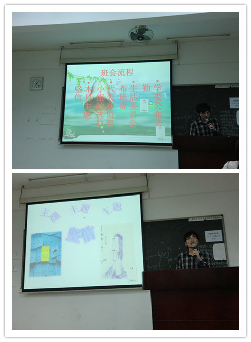这次的主题班会由班长曹永成担任主持人。在简单公布了近日班内的考勤情况及班费收支后,主题班会正式开始,主持人先向同学们展现了两张易引发人思索的图片,由这两张图片直奔本次班会的主题——坚信。细数一下,从刚踏入大学校门一直到今天,我们的大学生活已走过了420个日日夜夜了。此时,大二也已过去了一半时间,对于接下来的大学历程,同学们又将怎样坚持自己的理想呢?答案可以在接下来播放的电影《三傻大闹宝莱坞》中找到——追求卓越,成功就会出其不意地找上门来。本电影通过讲述一个叫Rancho的主人公自进入大学后如何坚持自己的理想并且帮助身边的同学坚持他们的理想,共同打开了一扇扇奇迹般的成功大门。让同学们深刻理解到“坚信”的真正含义,进一步思考:信念是成功之本。最后,主持人也借此机会向同学们发起倡议,希望同学们能从这一刻起坚信自己的理想,坚持不断的尝试和探索,相信自己终会成功。