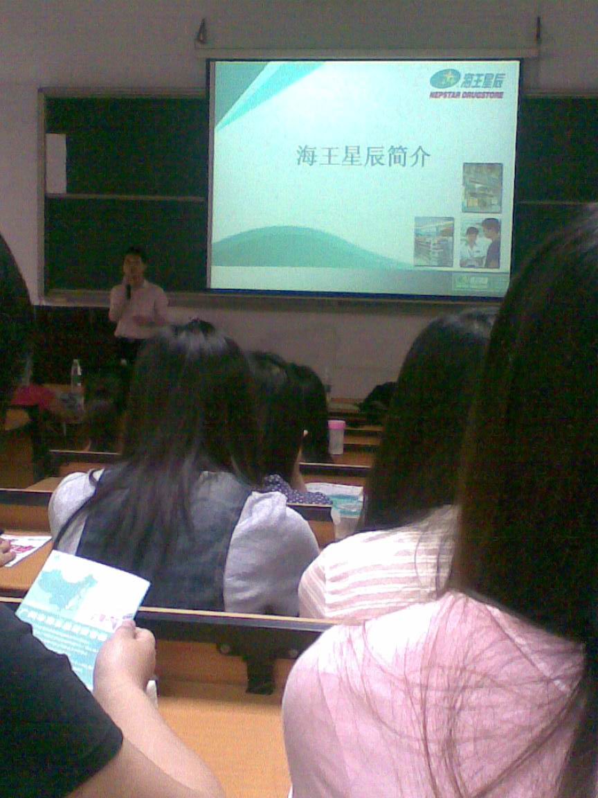该讲座由“海王星辰”代理主讲。讲座正式开始前,主持人简短地谈了职业方向,询问了学生的求职志向,引发学生的深思,从而引出宣讲会的主题。首先,他播放了一段短片为“海王星辰”作了简介,讲述了该药店的跨区域发展战略,管理技术优势,团队和人才优势等,以及连续三业的目标与使命。最后,他介绍了该企业对员工综合素质的要求。主持人宣讲完毕后,是现场提问环节,与会者积极提问,到场的杨经理和胡老师对同学们提出关于“海王星辰”的信誉和该药房多元化营销模式等方面的问题进行了一一解答,并赢得了在场学生的阵阵掌声,场面气氛十分活跃。宣讲会尾声,由现场实习生和毕业生进行招聘面试与咨询。