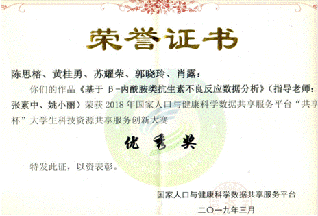 由药学院张素中副院长和姚小丽老师指导的15、16级药学院陈思榕、黄桂勇、苏耀荣、郭晓玲和肖露五名学生组成的团队,以作品《基于β-内酰胺类抗生素不良反应数据分析》荣获2018年第六届国家人口与健康科学数据共享服务平台“共享杯”大学生科技资源共享服务创新大赛的优秀奖。