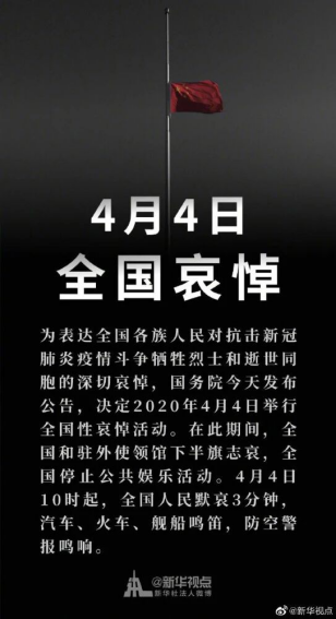 根据《国务院办公厅关于为新冠肺炎疫情牺牲烈士和逝世同胞举行全国性哀悼活动的通知》及学校《关于为新冠肺炎疫情牺牲烈士和逝世同胞举行哀悼活动的通知》(中新办[2020] 4号),中山大学新华学院药学院在学校及学院领导的号召下,全体教职工于2020年4月4日上午10:00居家与中央电视台同时默哀3分钟,为抗击新冠肺炎疫情牺牲烈士和逝世同胞表示敬意和悼念。