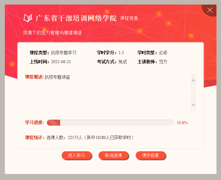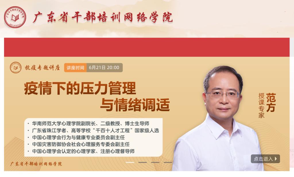 6月21日起,范方教授在广东省干部培训网络学院开讲抗疫专题讲座:《疫情下的压力管理与情绪调适》。学校师生登录网址,注册个人信息后,登录选择抗疫专题学习课堂进入学习即可。按时学习、查看课件,该课程免试。