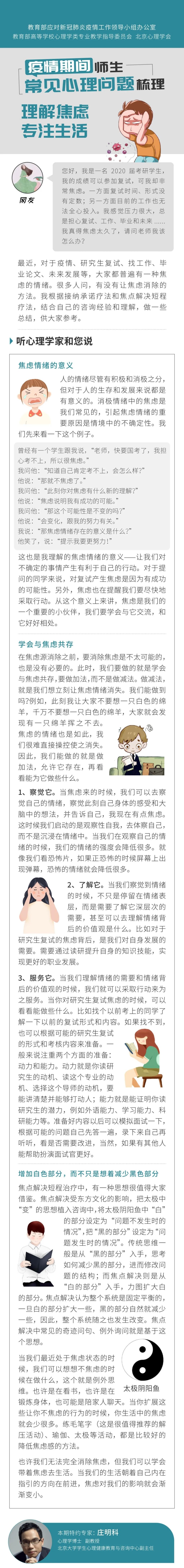 今天,推出《用“心”战“疫”》第(67)期,随教育小微一起来听北京大学学生心理健康教育与咨询中心副主任庄明科、中央财经大学心理咨询中心副主任刘凤娥详解,疫情期间师生常见心理问题如何调整↓↓↓