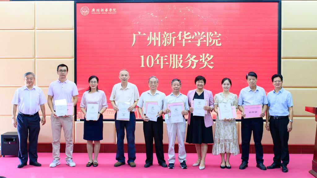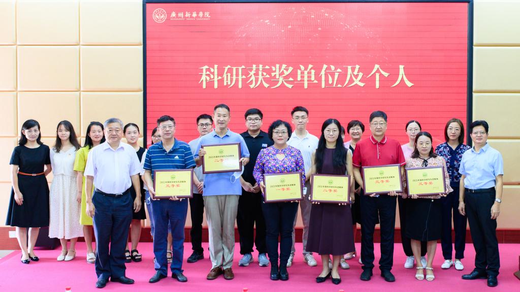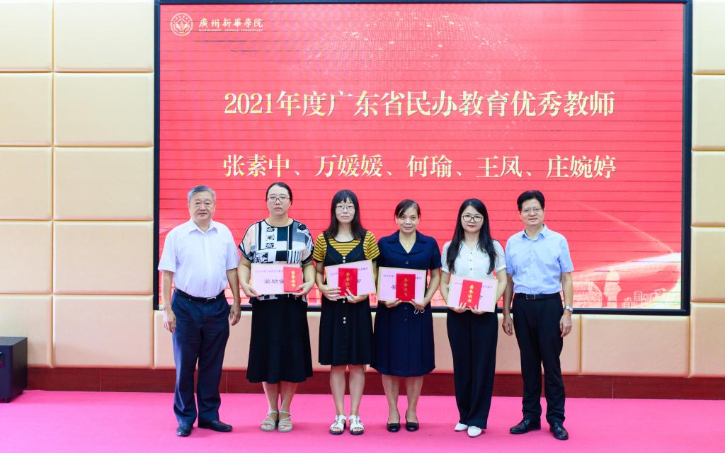 王庭槐校长、郝登峰书记为“2021年度广东省民办教育优秀教师”获奖者颁奖并合影留念