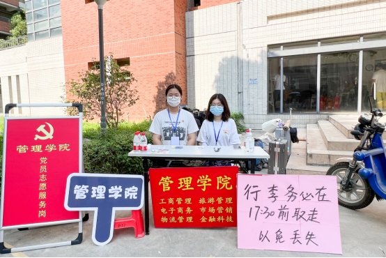 我为师生办实事,党员先锋在行动。管理学院在迎新报到点、新生宿舍楼等地设立党员服务岗。师生党员志愿者佩戴党员徽章,为新生提供报到协助、行李寄存等暖心服务。