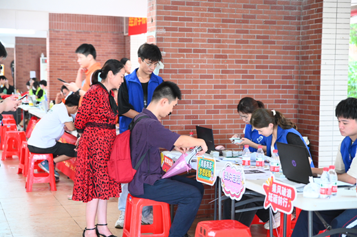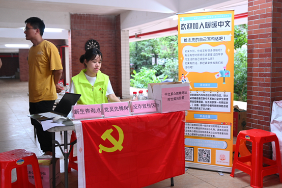 值得一提的是,为鼓励新生积极向党组织靠拢,让党旗在迎新一线高高飘扬,管理学院、中国语言文学系等多个院系党总支在迎新报到现场设立党员先锋岗,现场接收新生们的入党申请书,并为新生提供现场咨询、反诈宣传、失物招领等服务。
