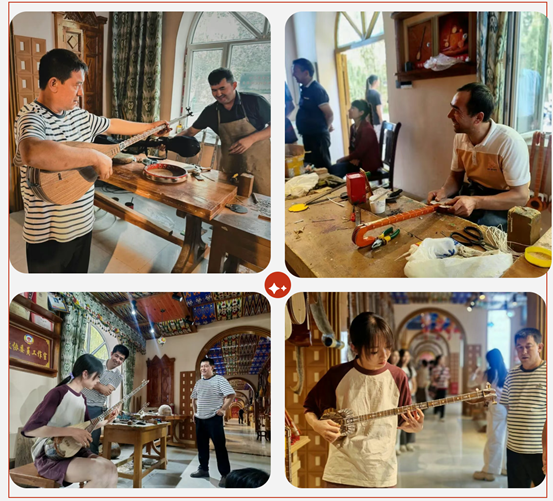 在校园参观中,师生们重点考察了音乐与舞蹈学院的教学设施,包括石榴剧院、舞蹈教室、器乐排练厅等专业场所。在非物质文化遗产传承人马穆提·热合曼老师讲解下,大家了解了都塔尔、热瓦甫等新疆传统乐器的制作工艺和文化内涵。师生现场试奏都塔尔,与当地演奏家即兴合奏,用音乐传递粤新两地人民的真挚情谊。