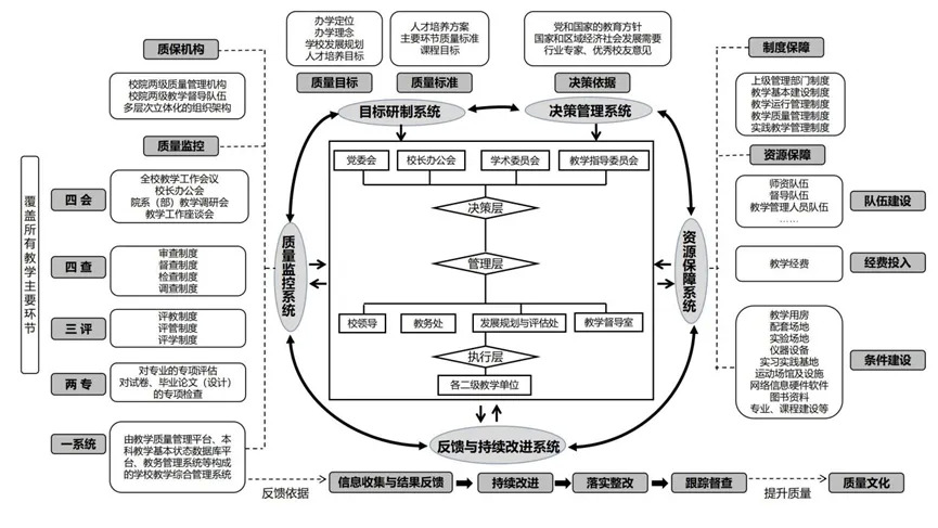 构建教学质量保障体系,形成校院两级监控机制。制定《本科教学质量监控与保障体系实施方案》,建立教学质量目标研制系统、教学质量决策管理系统、教学质量资源保障系统、教学质量监控系统和教学质量反馈与持续改进系统等五个子系统,初步建立起涵盖培养目标、培养模式、培养过程、培养结果四维度的校院两级教学质量保障体系。该体系以质量文化为引领,强调自我约束、自我检查、自我完善、自我提升,实现协调运行与统筹联动,确保教学质量的稳步提升。