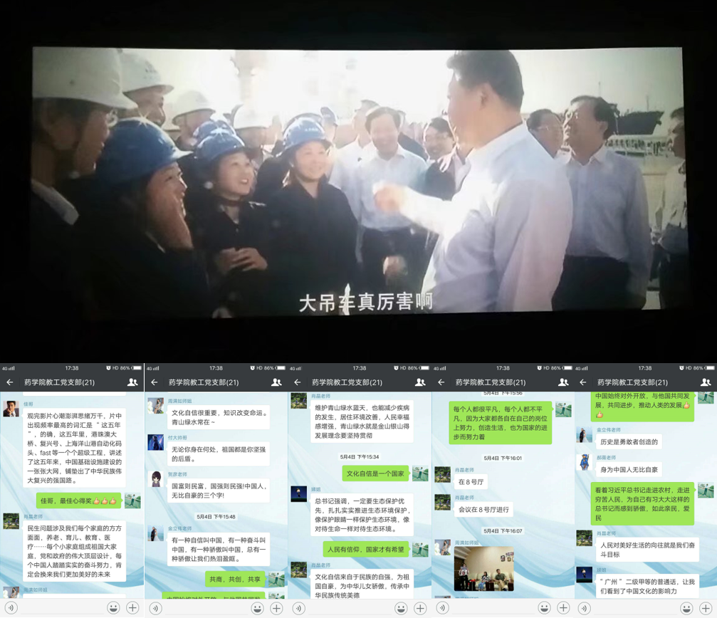 当天下午两个支部成员集体乘车,前往观看爱国影片《厉害了,我的国》。大家出发前对此影片已经有一定了解,满怀期待与激动的心情,非常积极地参加本次活动。当电影一开播时,大家都全神贯注地盯着大屏幕,看着大屏幕展示了中国在创新、协调、绿色、开放和共享的新发展理念下中国这五年的伟大成就,展现了中国人民在全面建设小康征程上的伟大奋斗,彰显了以习近平同志为核心的党中央的正确领导。凝聚起全党全国人民的磅礴力量,为实现中华民族伟大复兴的中国梦不断前进。看着这一幕幕的内容,大家脸上都洋溢出满满的自豪感,也不禁地在微信群里开始了说出自己的感受,如下截图: