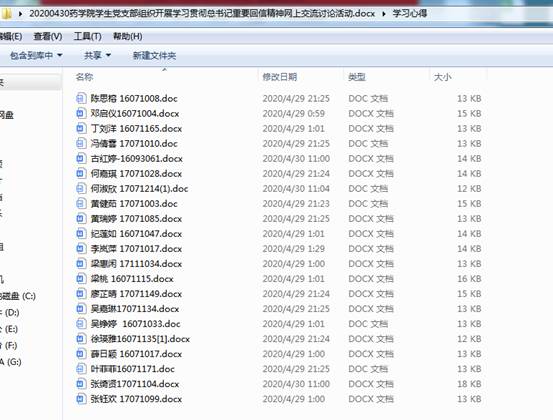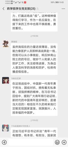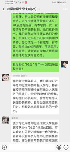 第二议程:党员及预备党员对此次会议高度重视。通过认真学习《习近平给北京大学援鄂医疗队全体“90后”党员的回信》后,全体同志向药学院党支部提交个人学习心得。在学习心得中,同志们表达了对所有抗疫工作者的感谢,以及表明了作为一名新青年、一名未来的药学人,会努力学好本领,锻炼自己的意志,向那些优秀的青年人学习,在国家需要的时候,能为国家奉献出自己的一份坚实的力量。