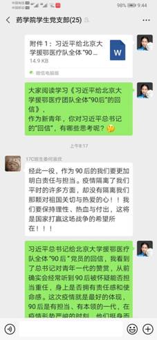 2020年4月27日8:00,中山大学新华学院药学院学生党支部于药学院学生党支部微信群组织开展学习贯彻习近平总书记重要回信精神网上交流讨论会。药学院党支部副书记陶强同志、药学院学生党支部书记鲁伟伟同志以及二十一名学生党员和学生预备党员参加本次会议。