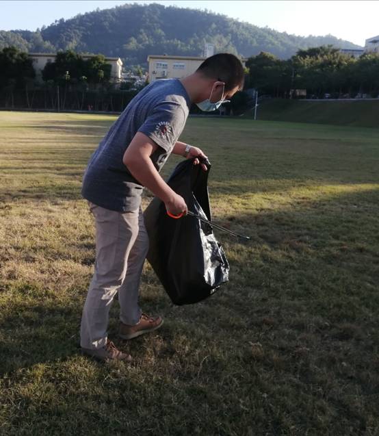 校园的角角落落,志愿者们有的拿着扫把将落叶等垃圾扫成小山堆,有的负责将垃圾小山装入自带的垃圾袋中,有的拿着钳子夹起草地的塑料垃圾,认真的志愿者们不放过任何一个角落,仔细地清理着。