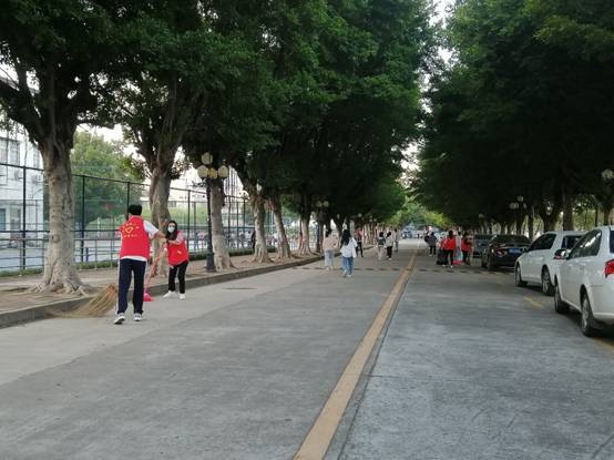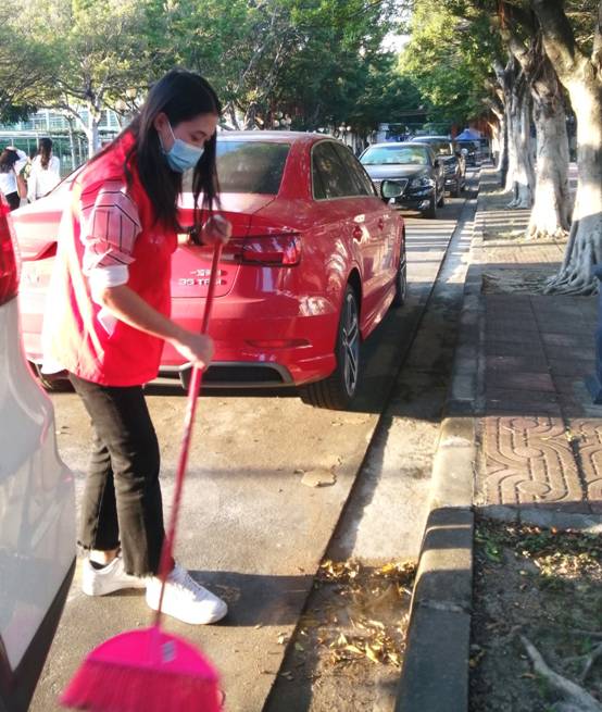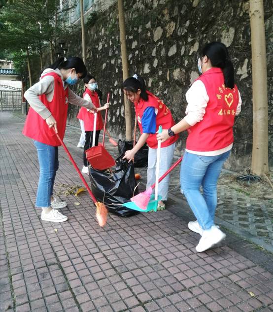 下午四点整,志愿者们到达集合地点后,换上鲜亮的红色志愿者马甲,拿上清洁工具,在明确打扫区域(校道及大牧场)后,听从负责人的安排,前往各自负责的区域,开始他们的志愿工作。