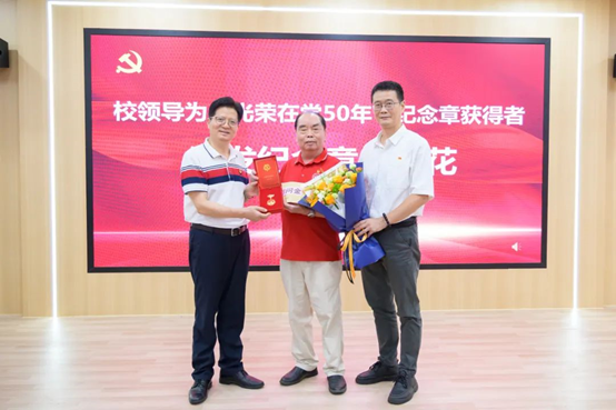 为庆祝中国共产党成立104周年,传承红色基因,凝聚奋进力量,7月1日,太阳成集团tyc33455在三全育人促进中心·思政育人空间举行“光荣在党50年”纪念章颁发仪式暨“七一”党员慰问座谈会。学校党委书记郝登峰,纪委书记林源,监事会监事长、“光荣在党50年”纪念章获得者蓝永金,以及青年党员代表、新接收预备党员代表与受慰问党员代表共同出席了本次活动。