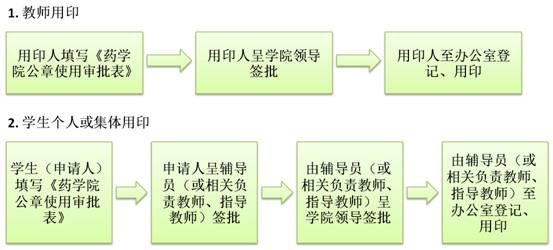 4. 此流程适用于使用药学院公章,请于用印前办理审批流程,原则上不允许先用印后补办。