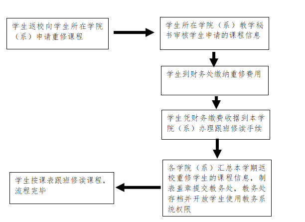 (2)学生本人下载、填写《太阳成集团tyc33455学生返校重修申请表》(一式三份),并提交申请至学生所在学院(系)审核。学生到财务处缴纳重修费用,凭财务处的缴费收据到所在学院(系)办理跟班修读的手续。