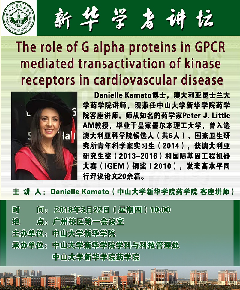 【学者讲坛预告】 Danielle Kamato: The role of G alpha proteins in GPCR mediated transactivation of kinase receptors in cardiovascular disease