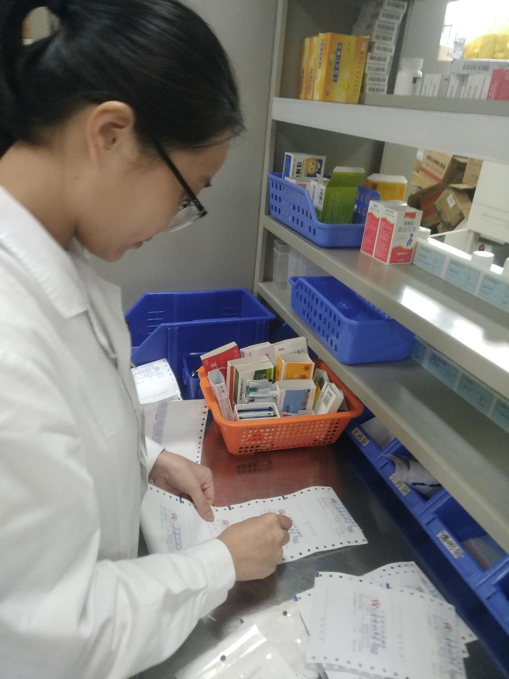实习生涯的第一站---西药房。在老师的带领下,熟悉了西药房的工作流程和药品分类与陈列,之后就投入调配处方的工作中。西药房是面对门诊患者的一个药房,所以每天来拿药的患者都得排很长的队取药,而里面的我们则忙到不可开交。西药房有一台自动药物颗粒调配机器,可调配零散的药,这大大的减轻我们的工作量。一开始拿到一张处方单,都不知道药的摆放位置,只能一个一个的问,后来时间长了,拿药速度快且出错率比较低。还记得刚开始去的时候人不熟,环境不熟,拿错药被叫号,心情很烦躁,工作都提不起干劲,现在回过头看看,那个时候的自己是多么稚嫩,刚踏出社会,什么都不懂,一时接受不了自己一天错那么多次,也花了很长时间去处理与同事和药师的关系,还好西药房的老师们都很好相处,非常乐意与人交流,不仅给我们解疑,而且出题目考我们,使我们受益匪浅。西药房虽忙但却是最愉快的。
