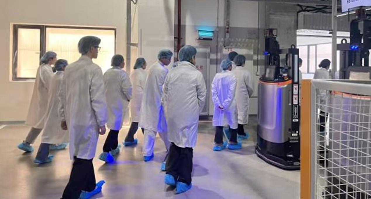 紧接着,大家走进了智能化综合物流仓库。通过现场展示,同学们见识到了先进的智能物流系统在药品存储与流通中的高效应用,为药品质量全程保障提供了有力支撑。