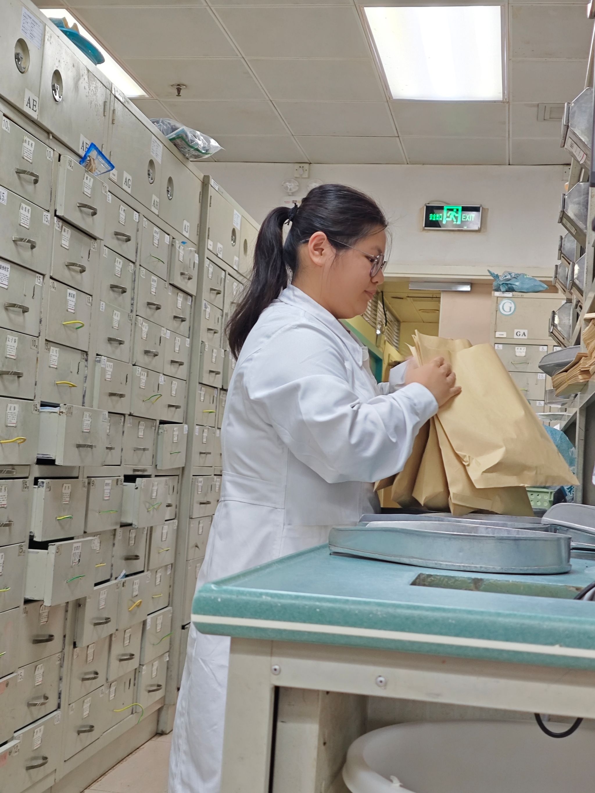 第四站就是中药房,在中药房的学习主要是调配药品的工作。中药房的中药不像以往需要称重调配,现在主要是以包装好相应克数和药材的包装,可直接取相应的克数即可,但是我们在调配中药时要注意与处方对应的克数,因为中药柜的药材的包装有多种克数并且在相邻的位置,容易拿错。在中药房还能见到书本上对药材描述的特征现象,例如黄连的“过桥”、辛夷的“毛笔头”和黄芪的“菊花心”等现象,生药书本上所貌似的现象,体会到知识具体化,对相应的知识更加的深刻。