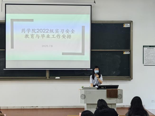 会议最后,药学院党总支副书记庄添围绕实习期间的安全教育及毕业生相关工作安排进行了重点讲解。在安全教育方面,庄老师提醒同学们要增强安全意识,切实做好自我防护,提高警惕,防范各类安全隐患。随后,庄老师对毕业相关工作进行了系统介绍。此外,针对当前就业形势,庄老师鼓励求职的同学要提前进入状态,积极参加校园招聘会,把握校招黄金期。她建议同学们在择业过程中保持理性态度,优先考虑就业的实际需求,保障自身就业权益。