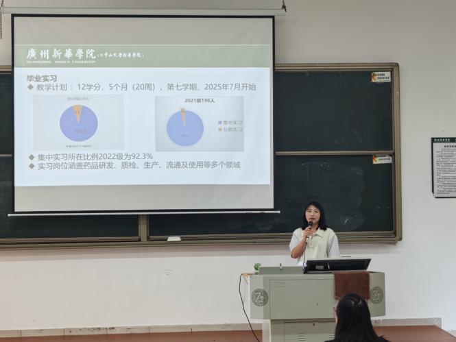 随后,姚小丽老师就本次毕业实习的整体安排与具体要求进行了详尽说明。姚老师指出,2022级药学院毕业实习将于2025年7月14日全面启动。据统计,92.3%的同学(共计203人)选择集中实习。本次实习岗位涵盖多个方向,包括药品研发、质量检测与生产、医院及社会药房等,为同学们提供了多样化的实践平台。姚老师鼓励大家尽快完成从学生到“职场人”的角色转变,积极适应新环境,主动学习、善于提问,不断提升自身综合能力。同时,姚老师也重点强调了实习期间的相关管理规定,包括请假流程、缺勤处理办法以及需提交的材料清单。她提醒同学们务必严格遵守实习单位的各项规章制度,展现药学院学子良好的精神风貌和职业素养。