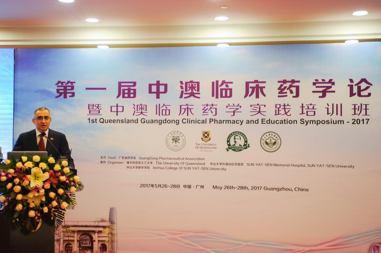 5月27日,由广东省药学会主办,澳大利亚昆士兰大学、中山大学孙逸仙纪念医院、中山大学新华学院联合承办的首届中澳临床药学论坛暨中澳临床药学实践培训班(以下简称论坛)在广东广州举行。论坛邀请来自澳大利亚昆士兰大学、亚历山大公主医院、墨尔本贝克心脏和糖尿病研究所、昆士兰大学马特研究所,中山大学孙逸仙纪念医院、西安交通大学附属第二医院、中山大学新华学院的10位临床药学和医学方面的著名专家学者,分为抗菌药物(含剂量优化篇、管理篇、输注篇、多重耐药菌篇、药代药动学篇、血药浓度篇)、用药差错、超说明书用药、药学教育与药学实践、医院药学与社会药学五大专场共带来23场主题学术报告,与来自中澳医院和高校一线的150余位临床药学实践的药师和药学专业教师一同,围绕“抗菌药物的研究及合理应用”主题,共同探讨如何优化抗菌药物使用方案。同时,通过本次学术交流以期助推中澳院校,特别是昆士兰大学药学院与中山大学孙逸仙纪念医院、中山大学新华学院三方在学术研究、人才培养、药学教育与药学实践方面的深入合作。