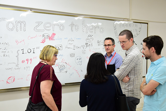 澳大利亚昆士兰大学药学院学者代表团在浏览 Fab Lab创新中心的“概念黑板”