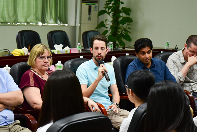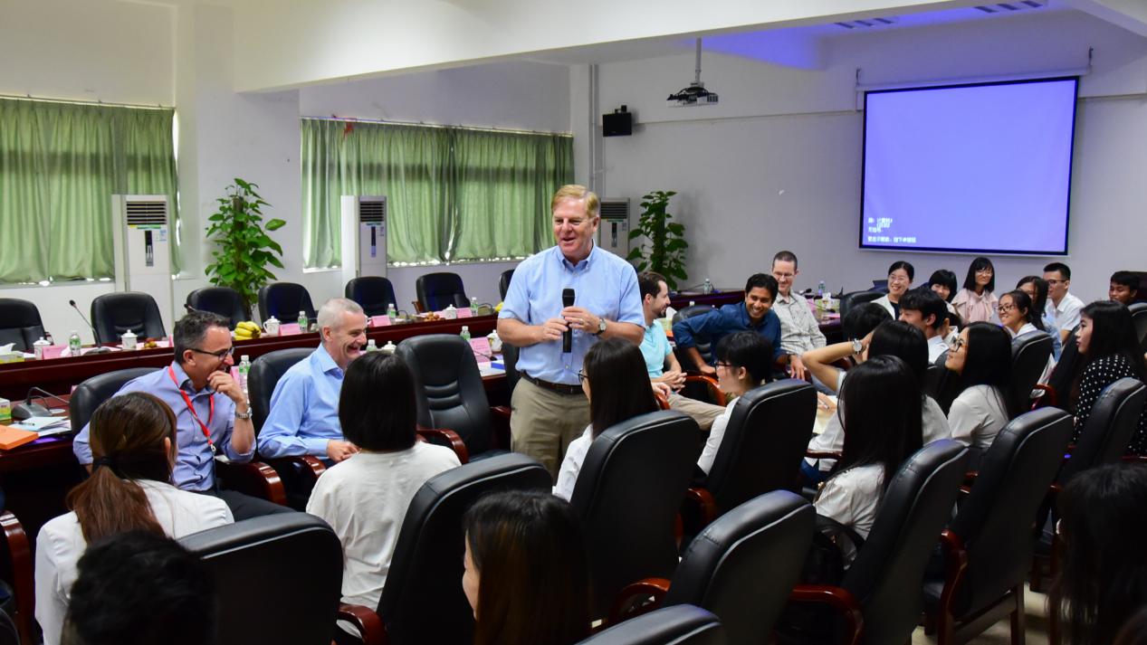 16级陈光伟同学就“如何成为一名优秀的药剂师”向Dr.Christopher R. Freeman提问,Dr.Christopher R. Freeman指出:认真完成专业课的学习,基础知识一定要扎实;多与同学老师交流想法,学会与团队共同完成工作;实践非常重要,医院、科室、工厂等,都是不错的实践地点。