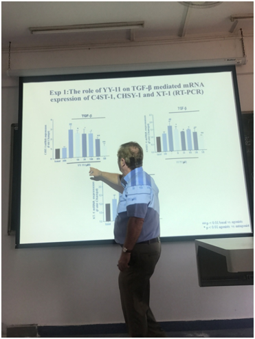 2018年7月12日下午,澳大利亚昆士兰大学药学院院长、我校药学系首席教授Prof. Peter J. Little AM在广州校区教学楼C204室举办了主题为“The effect of YY-11 on TGF-β mediated GAG chain elongation in human vascular smooth muscle cells”的讲座。药学院副院长张素中副教授出席,药学院老师代表参加,讲坛由药学院办公室主任曹颖男主持。