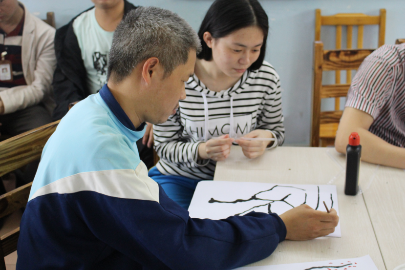 在观看完视频后,志愿者将残障人士们分为三组教学。在志愿者示范后,残障人士们凭借自己记忆中对梅花的认识,纷纷开始自己的创作。在残障人士们创作期间,志愿者也没有闲着,密切关注着各个人士的情况,在残障人士有需要的时候,上前为其解惑。一滴墨,吹散开来,竟成一幅美丽的画作。连经过培训的志愿者都对他们的创作能力赞不绝口。