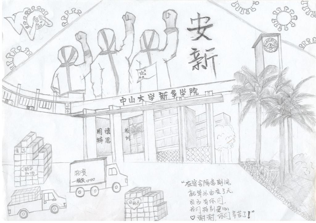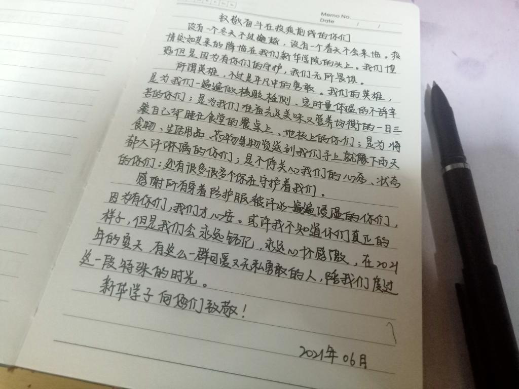 最后是可爱的新华,疫情来的突然,马上就开展相应的核酸检测工作,还有相应的考试安排及授课安排的调整。尽量满足我们的需求,饭菜在不断的改善,同时也配有水果,为了能让我们吃得更好。还有开启相应的美育课程缓解我们隔离的无聊。你都在尽力的满足我们,尽力的去为我们提供一个舒适的环境。感谢有你,感谢新华。