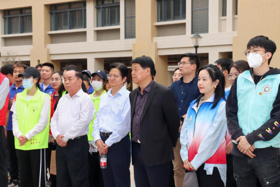 我校校党委书记郝登峰(左三)、副校长蓝永金(左二)、副校长李中生(右三)与师生志愿者一同参与义务植树活动