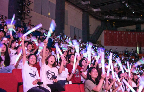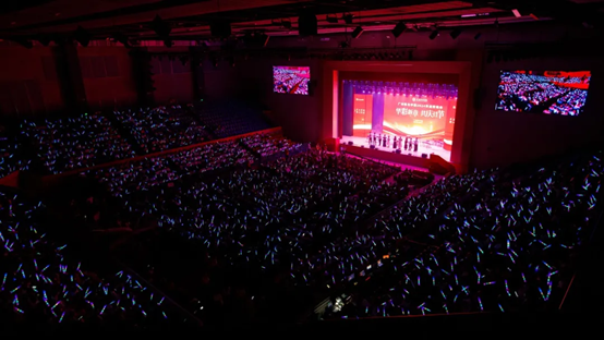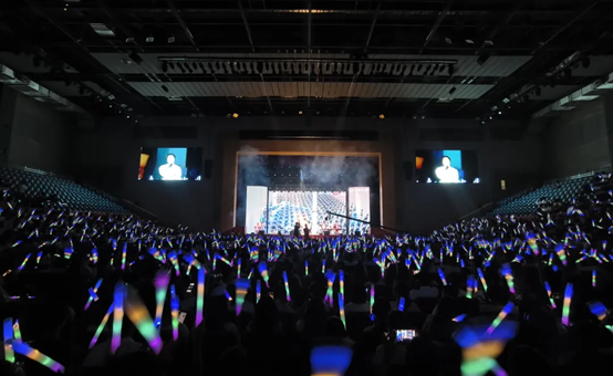 晚会现场人声鼎沸,师生们挥舞着绚丽的荧光棒,交织出一片璀璨夺目的梦幻光海。他们的目光紧紧锁定舞台,不错过每一个精彩瞬间,完全沉浸在这场难忘的视听盛宴之中。
