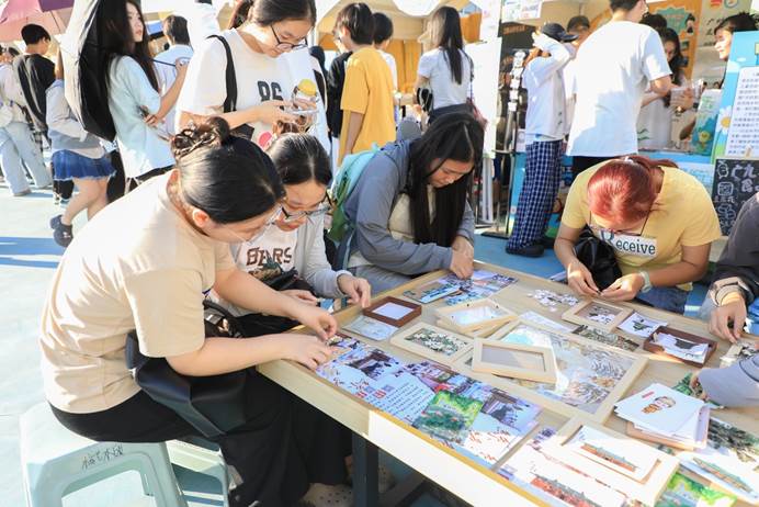 活动通过集市的形式,将青年突击队在乡村振兴实践中积累的经验与成果进行展示。现场热闹非凡,各类摊位独具特色,包括文创展示、农产品售卖、非遗体验等等,吸引了众多学生、老师参与了解并体验。