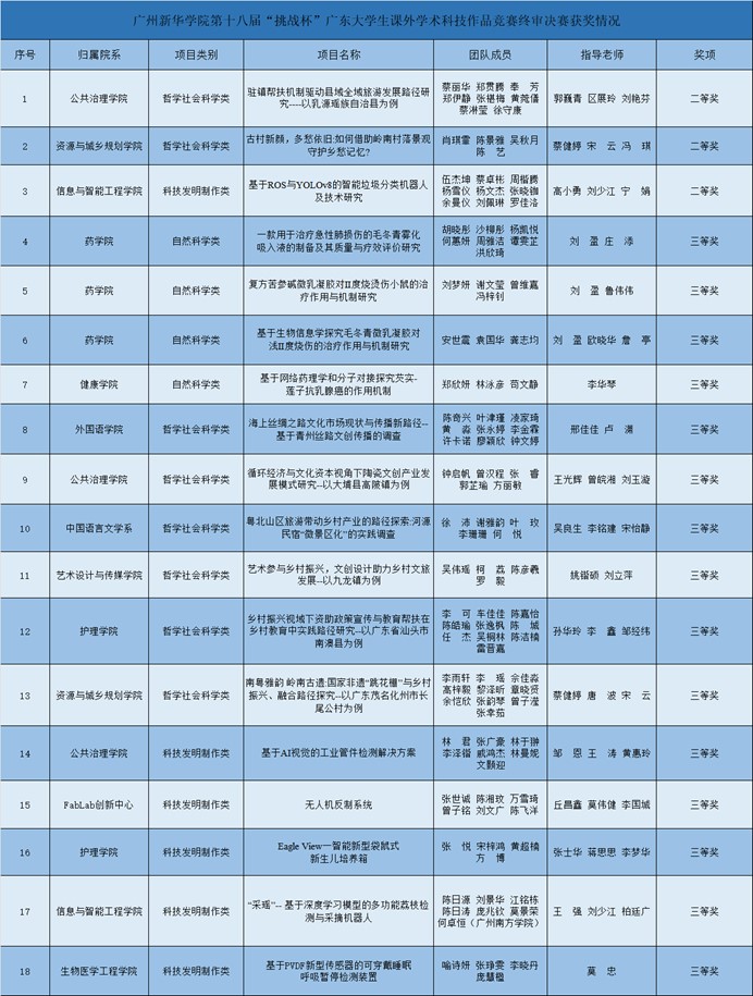 自2024年9月学校开展第十八届“挑战杯”广东大学生课外学术科技作品竞赛相关筹备工作以来,学校领导高度重视,多次召开专题研讨会部署“挑战杯”工作,院系精心培育和指导项目,今年学校共收到参赛申报项目117项;先后开展校赛复赛、决赛及省赛推优环节,后经评审评定及团省委发文有关推荐省赛项目的相关要求,最终推荐18个项目参加省级竞赛,其中15个项目拟授予省级三等奖,3个项目拟授予省级二等奖。省赛推荐项目均获奖,历史性突破学校“挑战杯”项目省赛获奖比例。